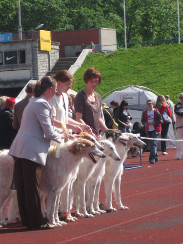 ENG: On Saturday was Central European Sighthound Show and it was 26 borzois judged by Swedish Judge Niklas Ericsson. Our Zoya was excellent - winning open class and CAC title , as well Best of Opposite sex title and she became Central European Winner 2010 ! BOB became handsome male from Sweden - Linx Winds from Russia owned by Vendula Svobodova. BIS was winning by beautufull afgan bitch Ch Oudry Gandamak, owned by Bakosz Szilla. On Sunday at Club show 30 borzois were judged by George Kostopolus from Greece. Zoya achived 2.nd place and R.CAC title in open class. BOB went to open class female Amuri Pajkos -Ganja - owned by Martina Buchova, while BOS went to champion male Ante Portas Stepowy Goniec - owned by Magdalena Rebeš.