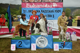 ENG:At the end of August was CAC Trbovlje, and this year was 51 Sighthounds ( 20 borzois ), judge was Mrs. Sanda Terzić from Croatia. It was not nice weather, but we had a GREAT day: Luc got CAC in intermediate class, Zoya was CAC,BOB, BOG and R.Best in Show !! Over the moon :-))) Congratulation also to Hrženjak Family: young Ninochka's Aurora Akoya at by H.R.I.B. was winner of the young class!